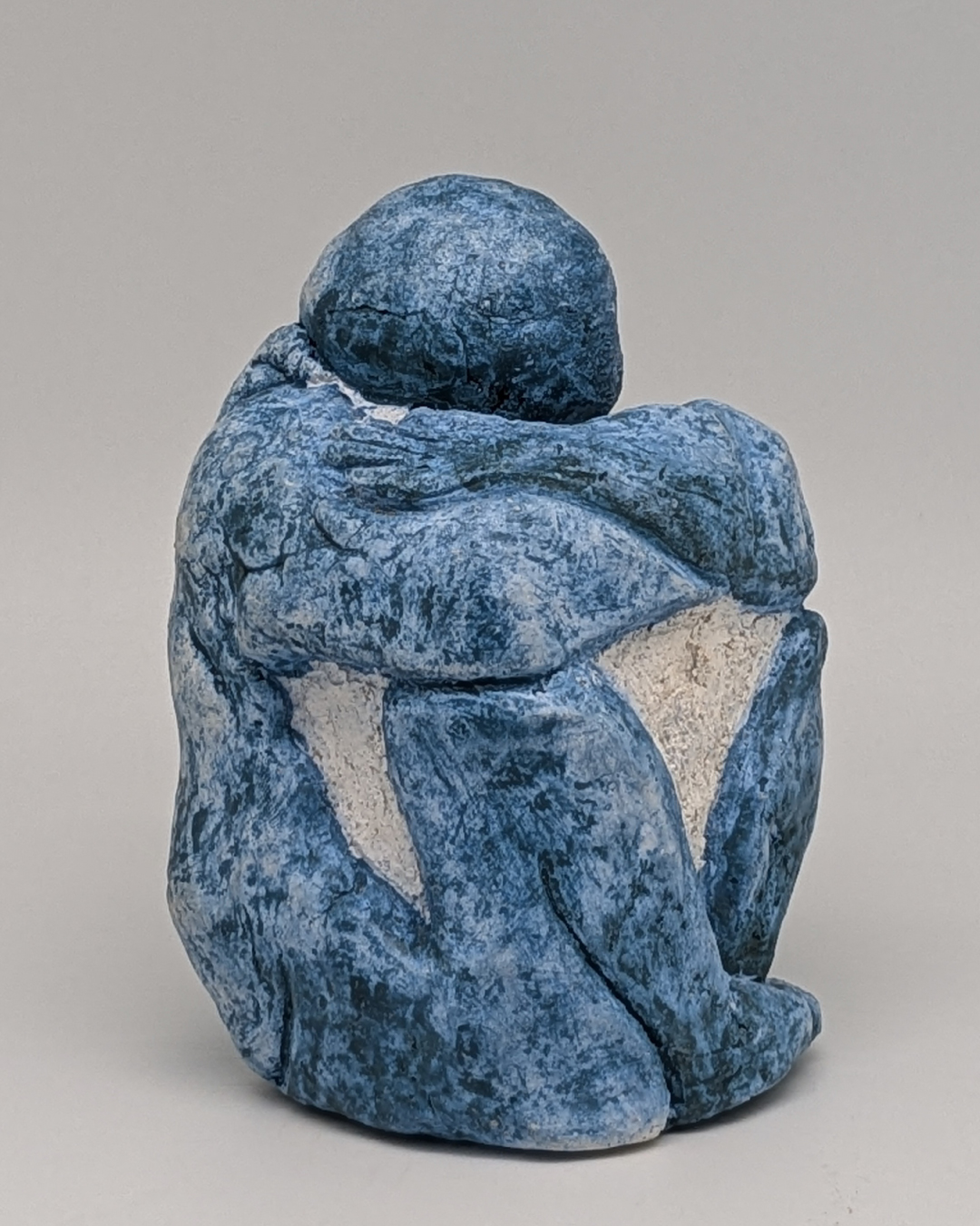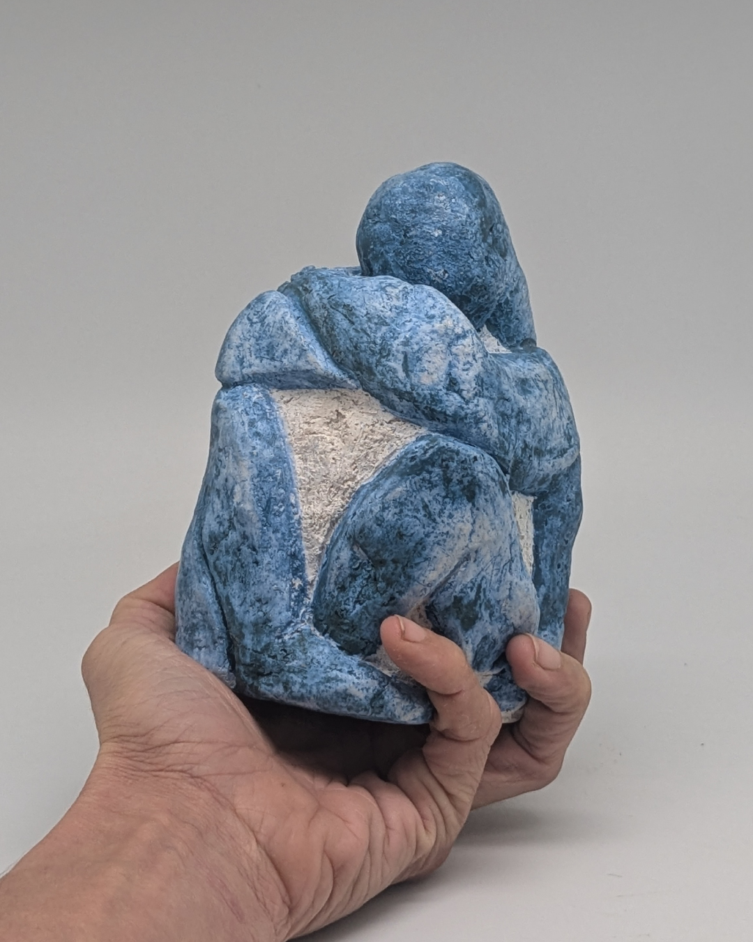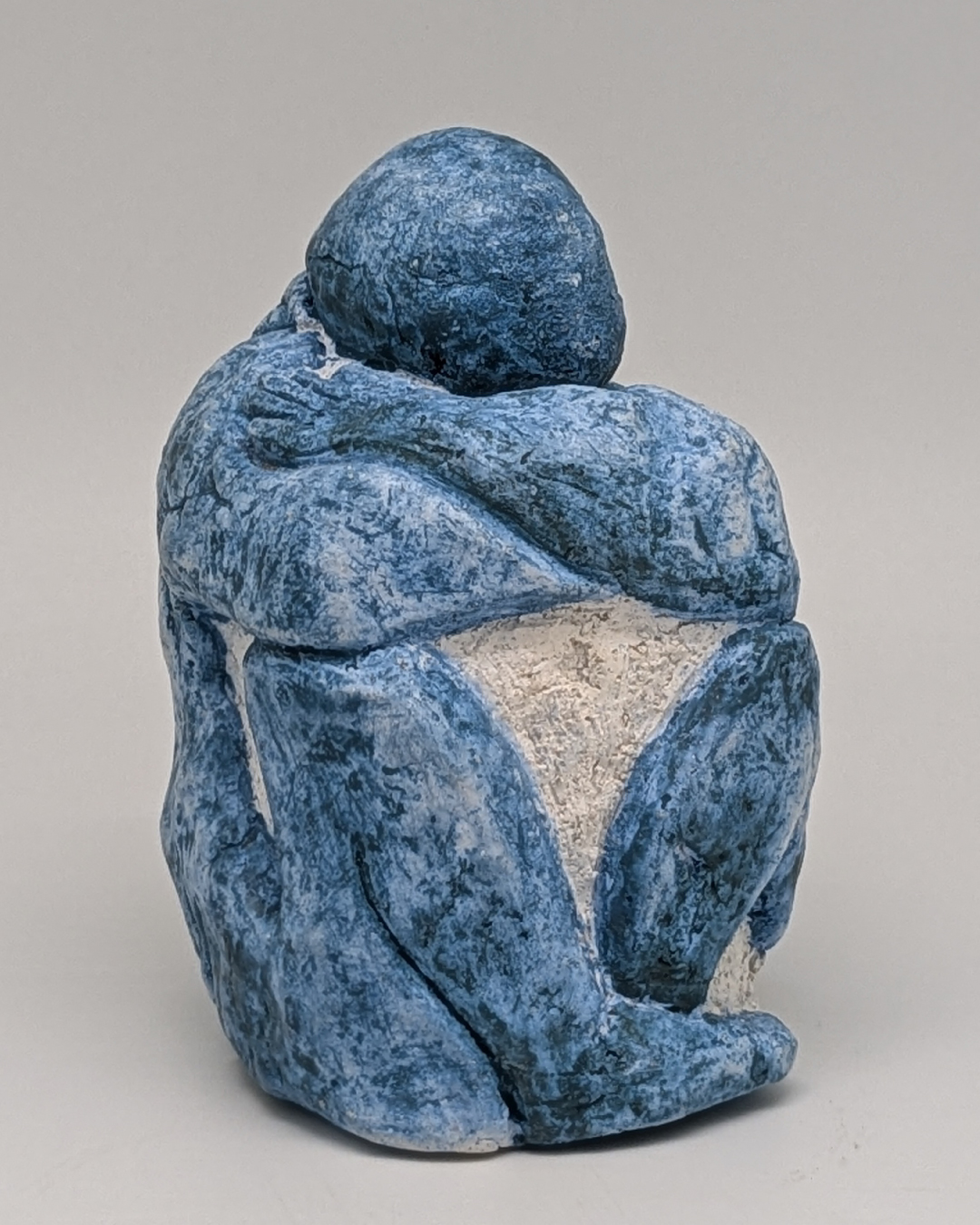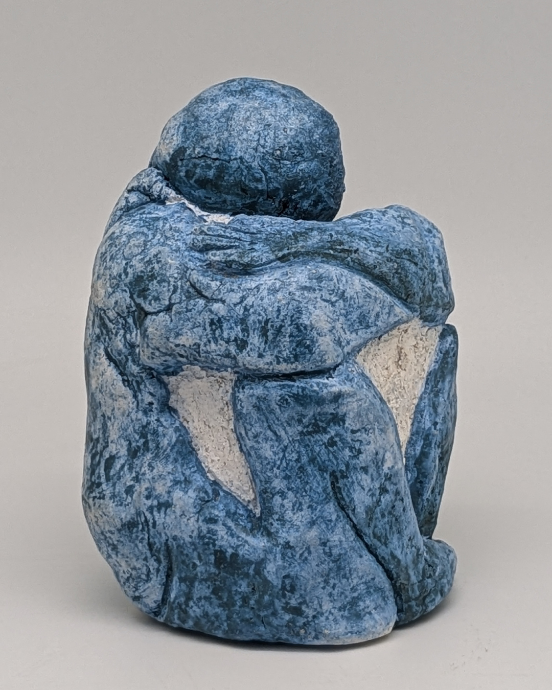 Homme bleu - Sculpture en grès, ses couleurs dominantes sont bleu et blanc