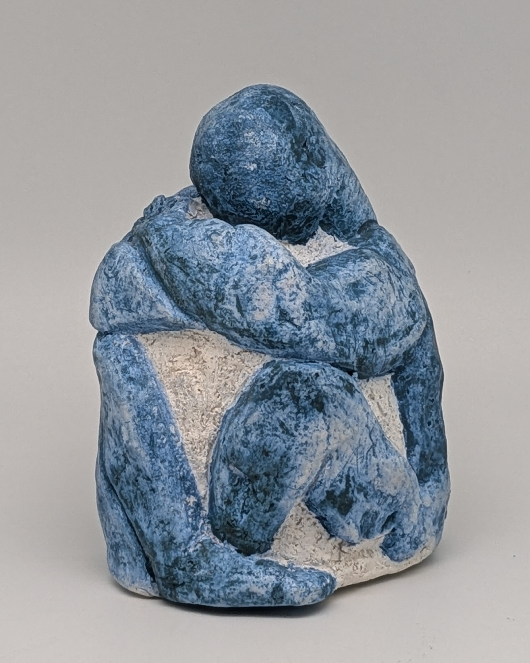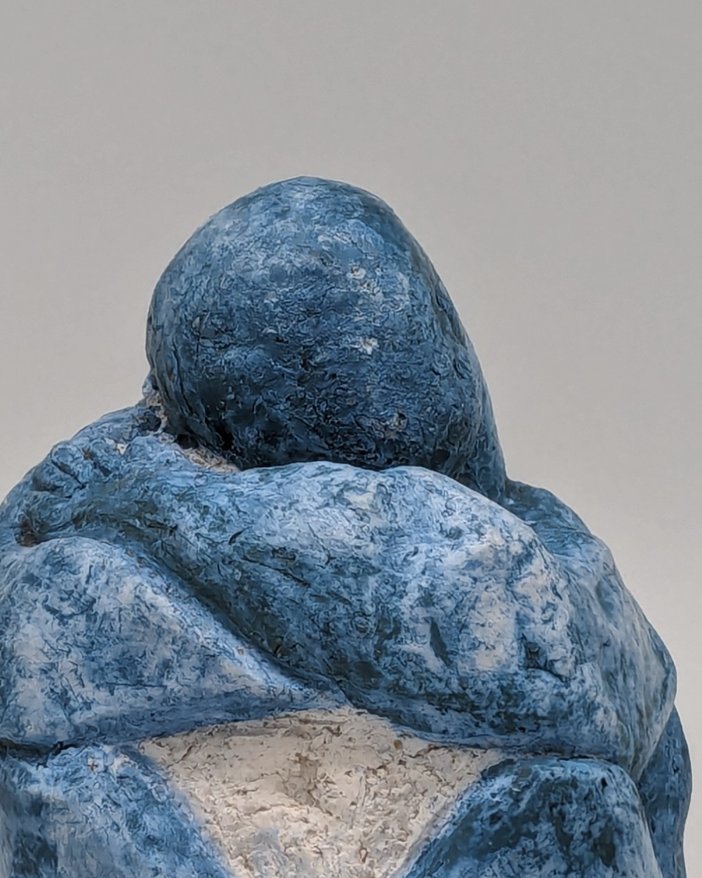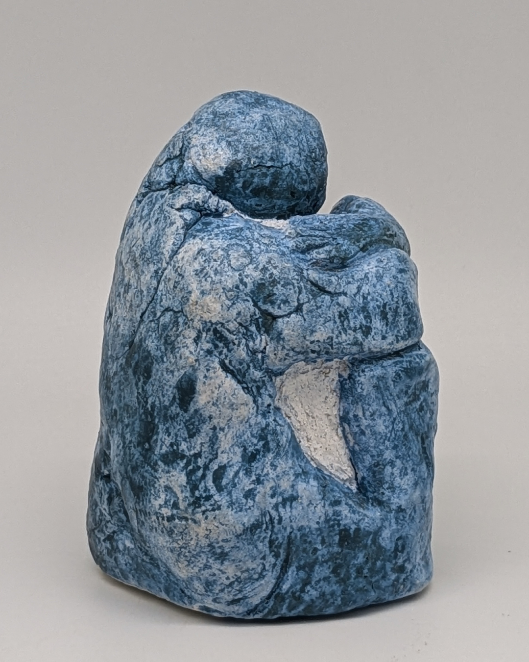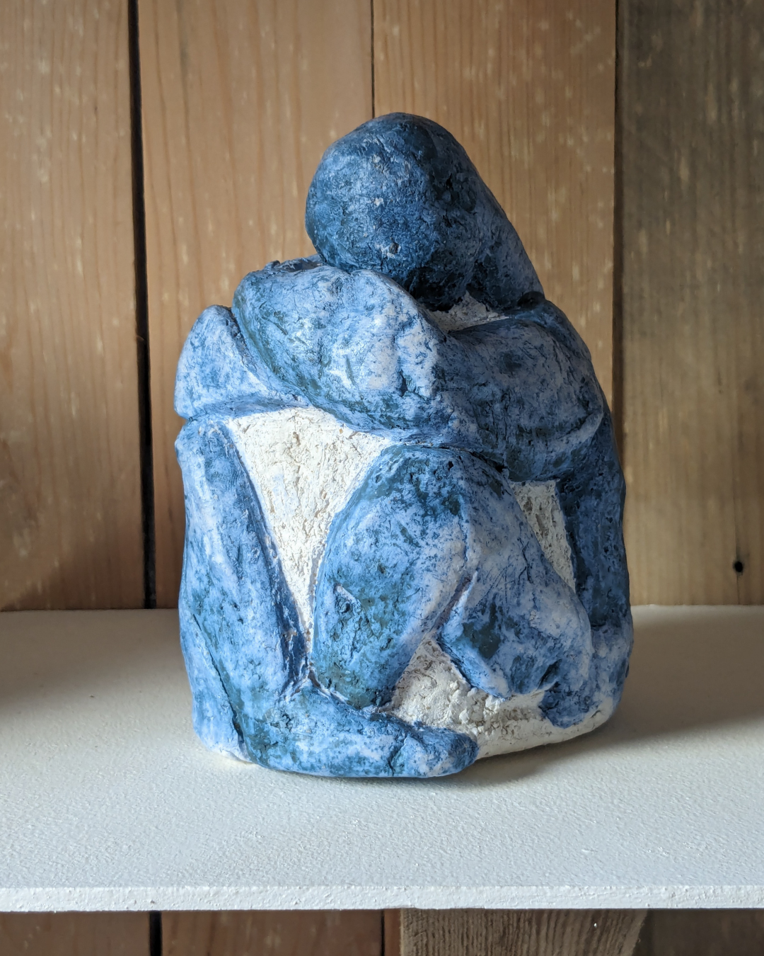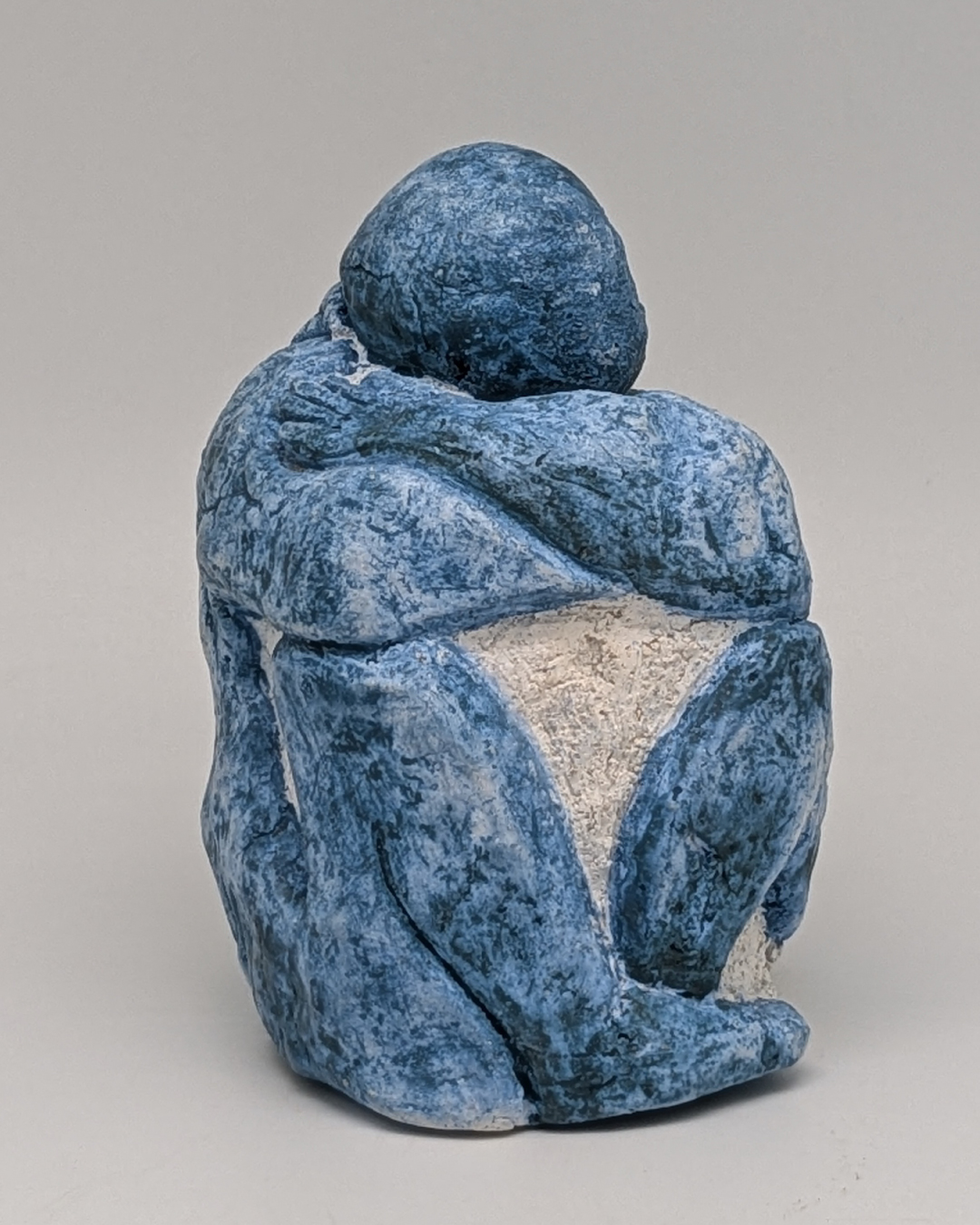 Homme bleu - Sculpture en grès, ses couleurs dominantes sont bleu et blanc
