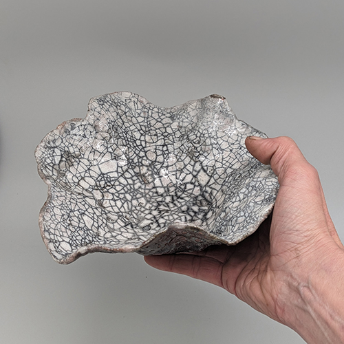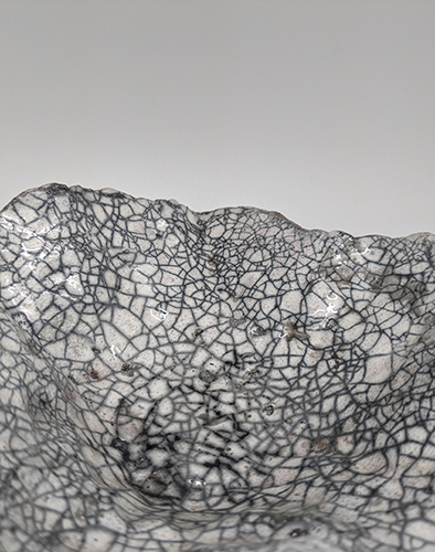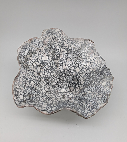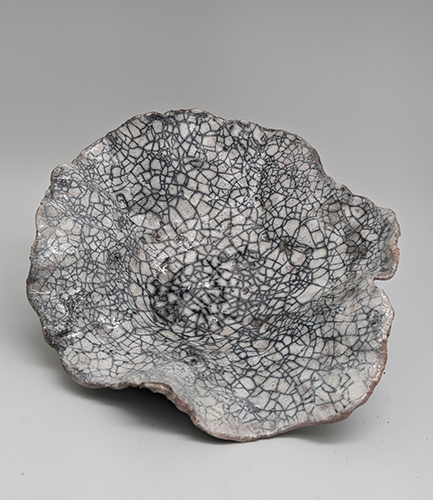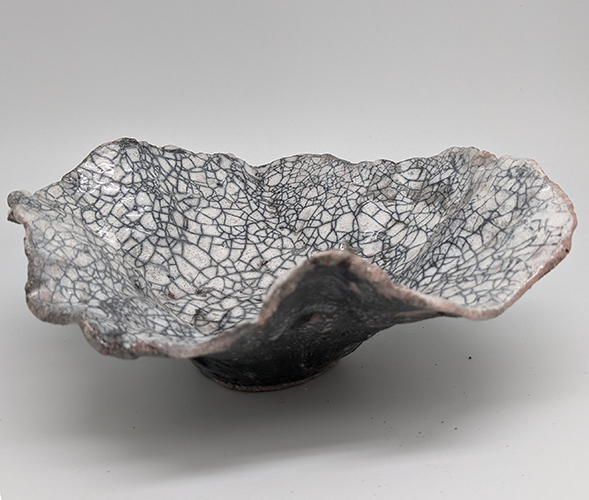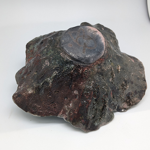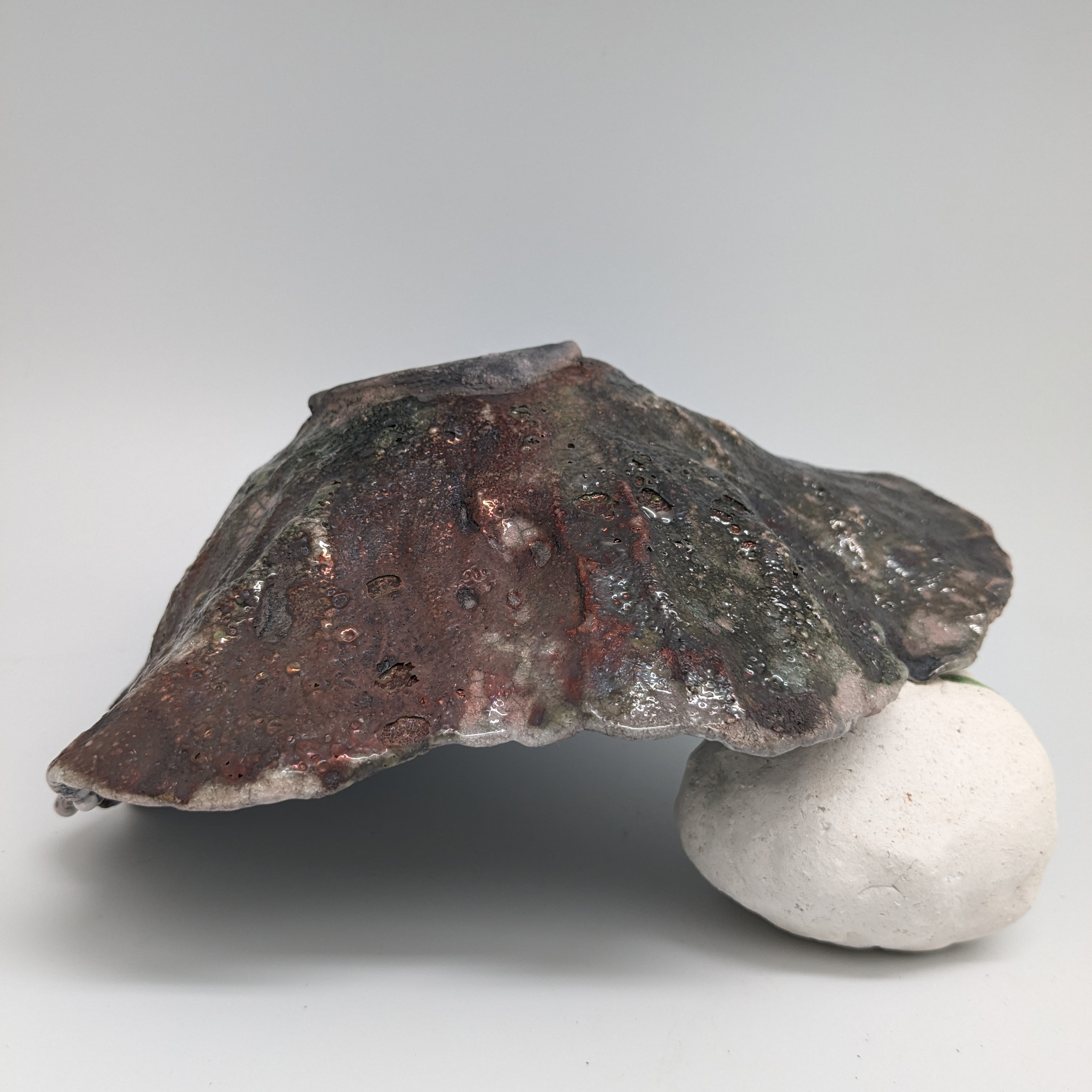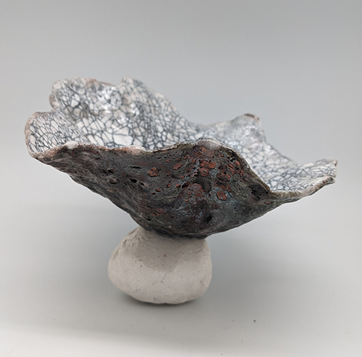 coupe corail - Coupe en grés enfumé, ses couleurs dominantes sont blanc et gris pour l'intérieur, et pour l’extérieur vert sombre avec les touches cuivrées apportées par la phase réductrice de la cuisson.
