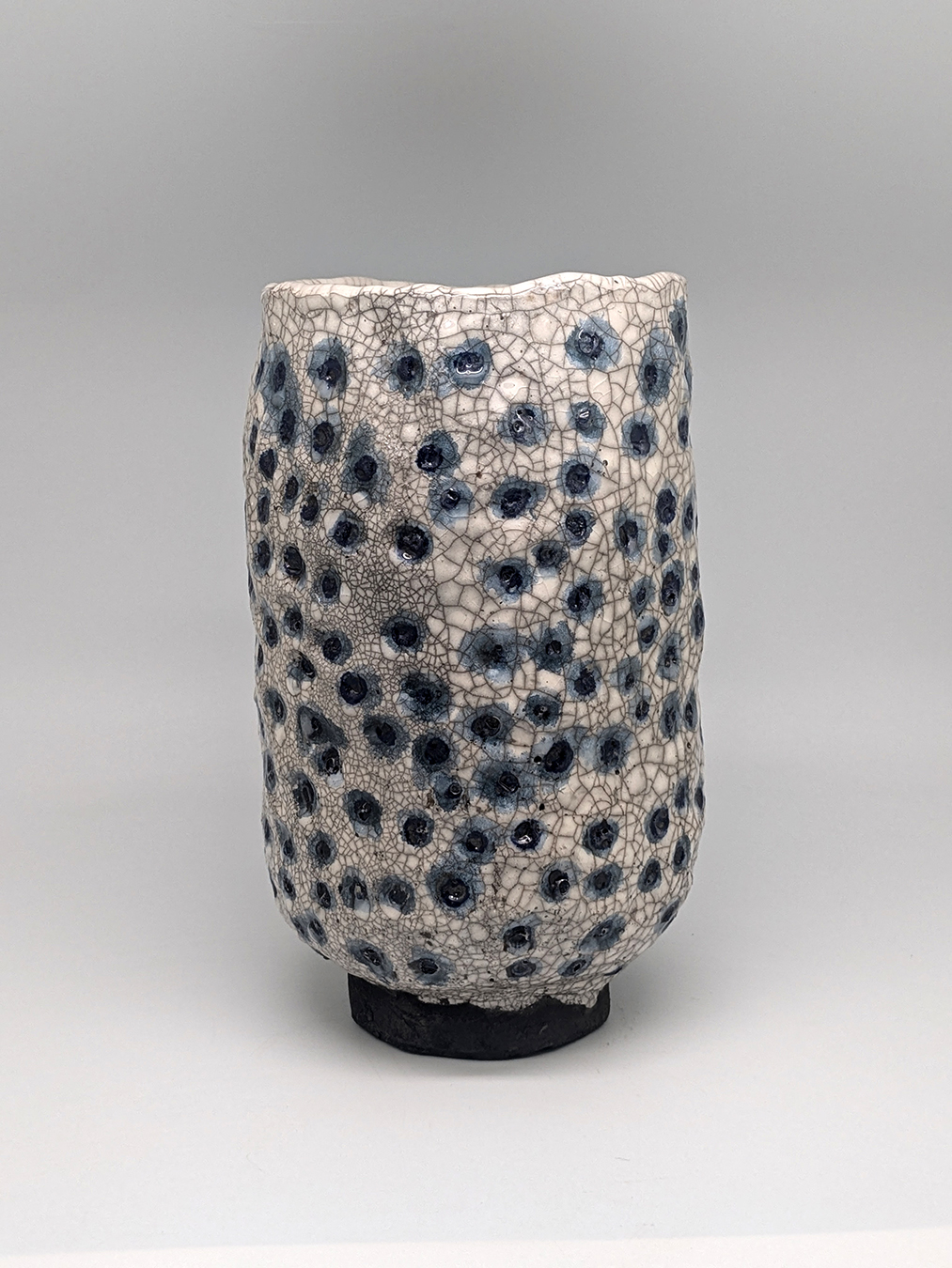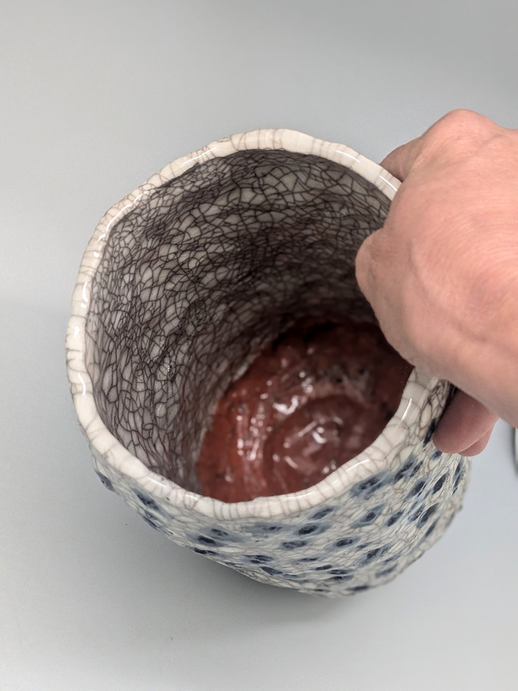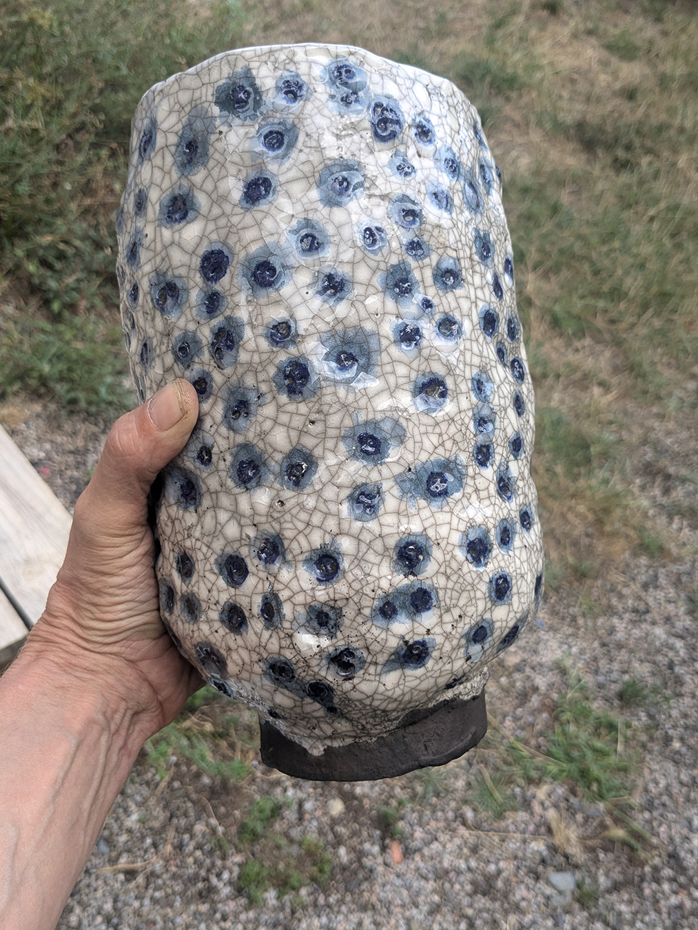 vase corail - Vase en grès enfumé, ses couleurs dominantes sont blanc et bleu à l’extérieur, l'intérieur est blanc et ocre dans le bas.