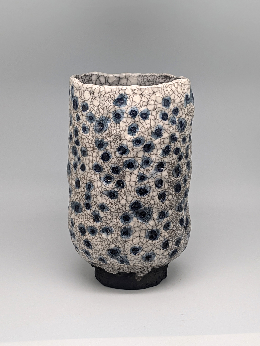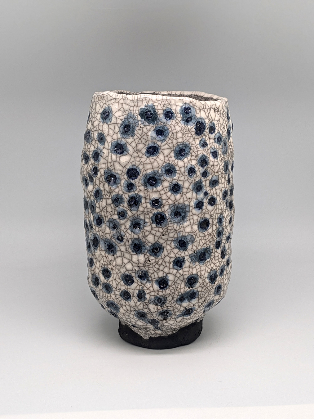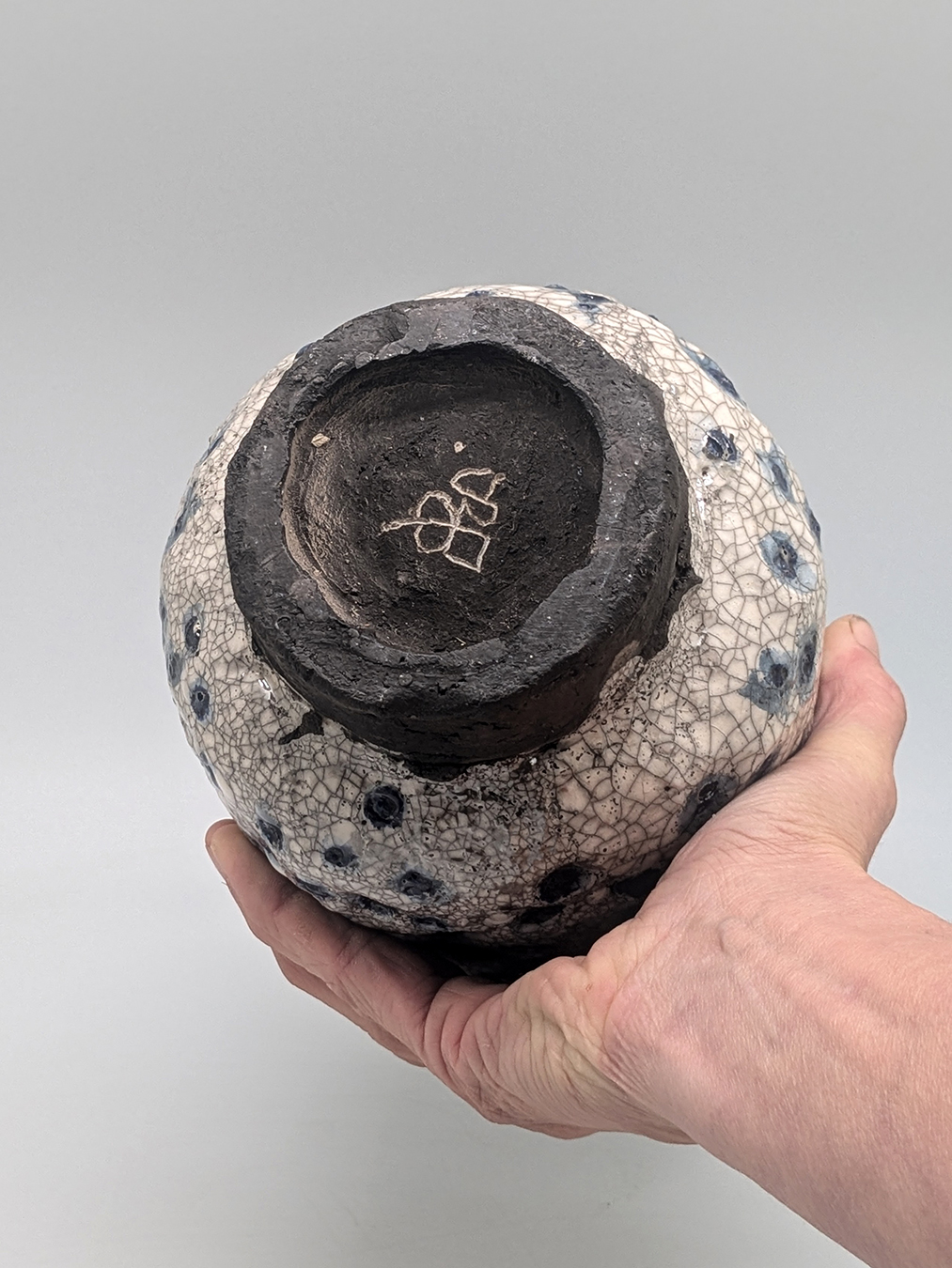 vase corail - Vase en grès enfumé, ses couleurs dominantes sont blanc et bleu à l’extérieur, l'intérieur est blanc et ocre dans le bas.