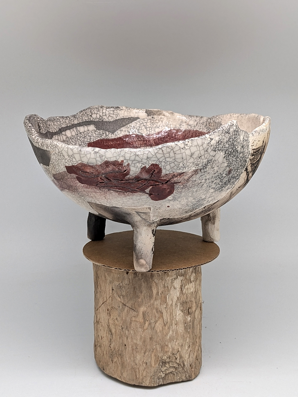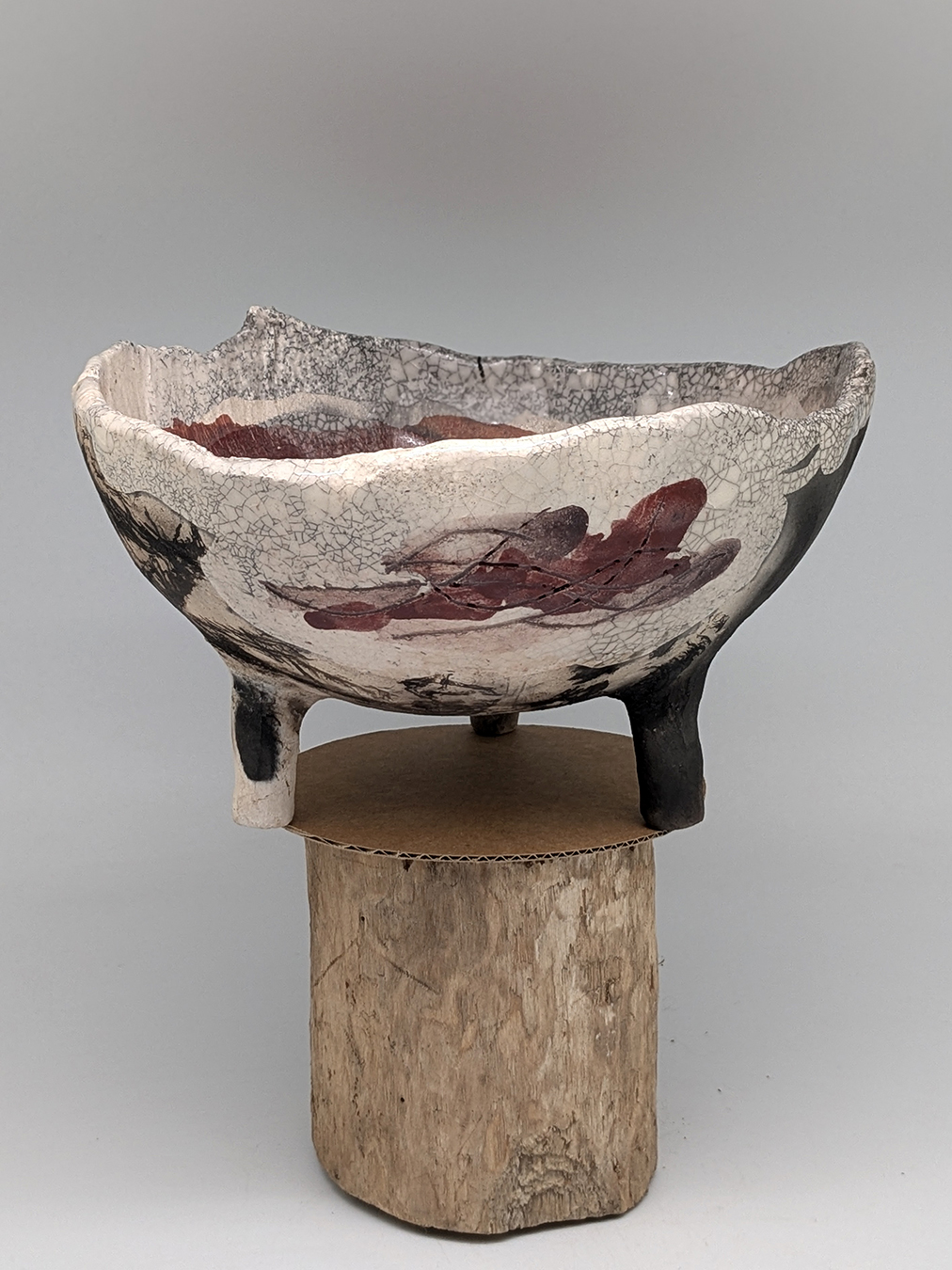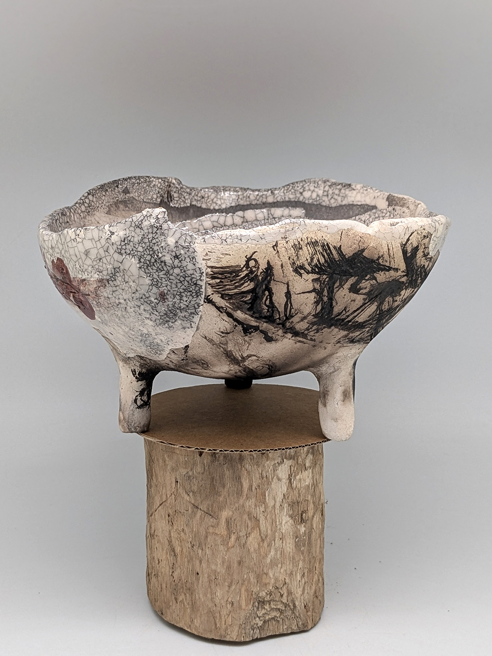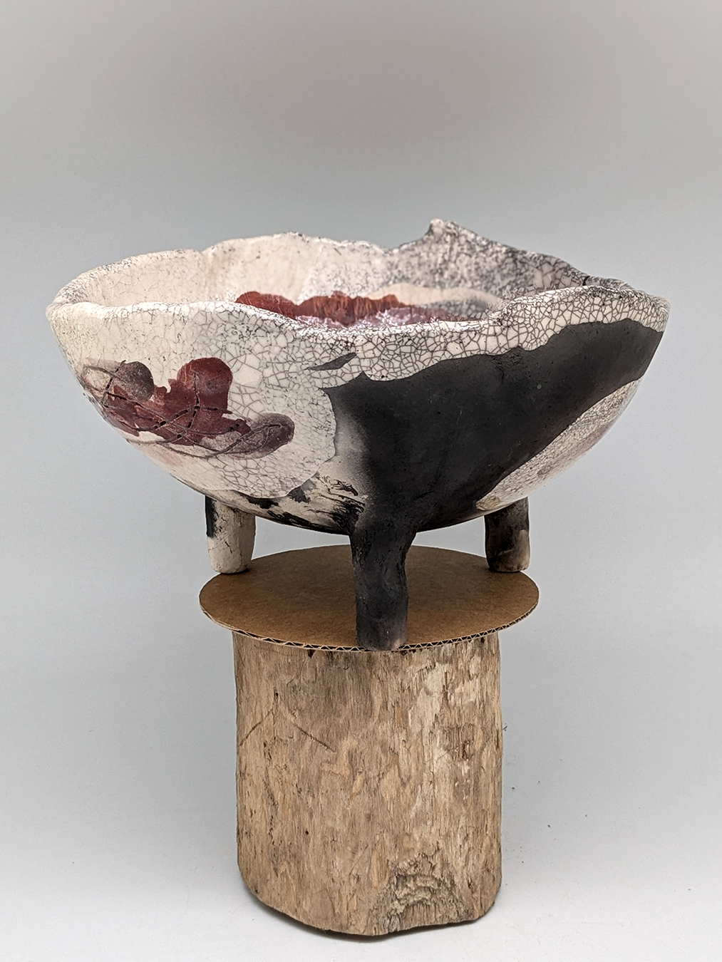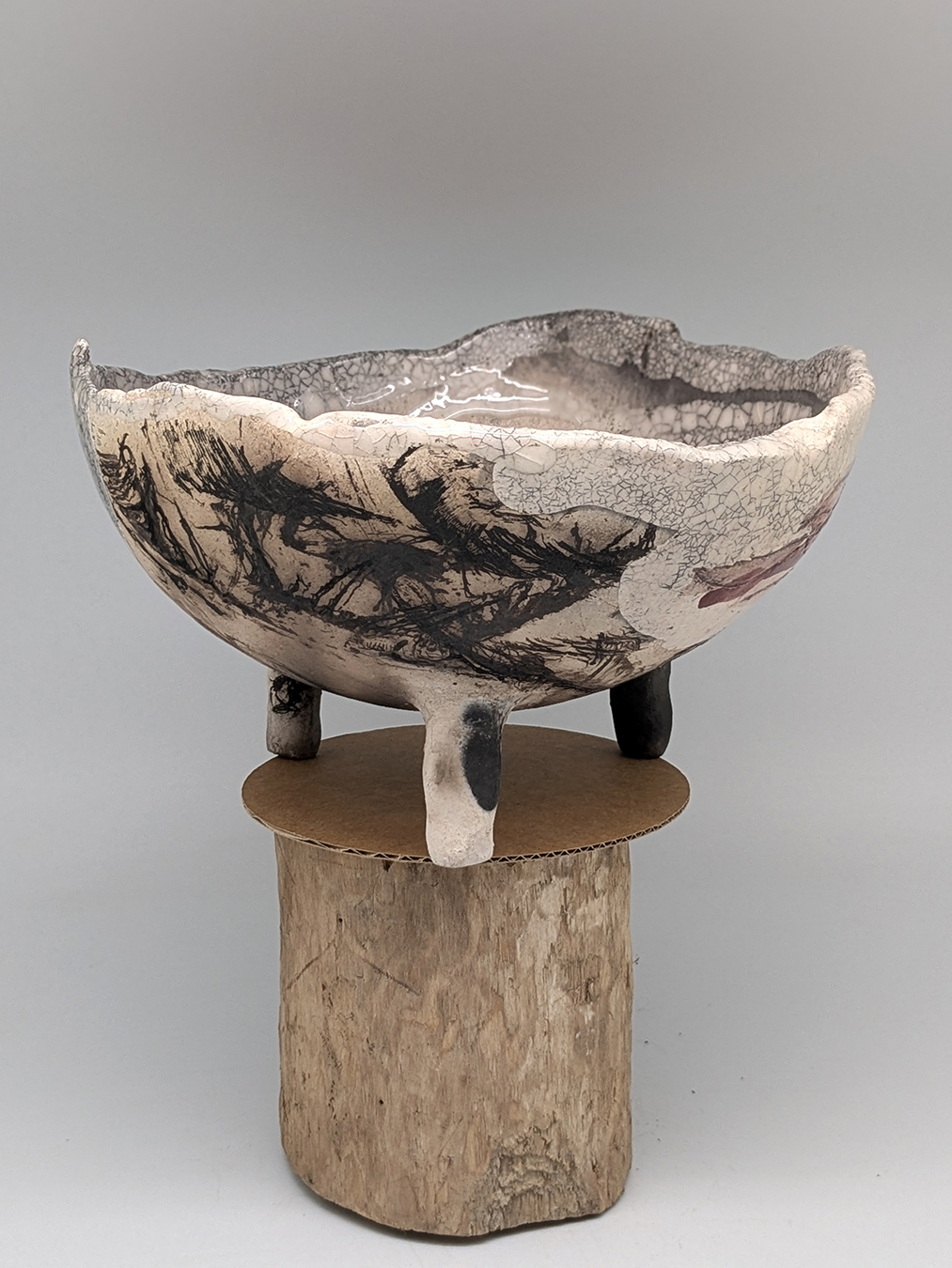 Petite coupe tripode, ses couleurs dominantes sont blanc, ocre, rose, gris, noir...