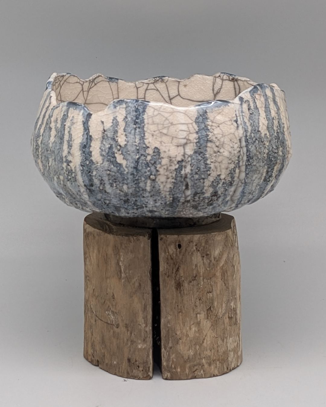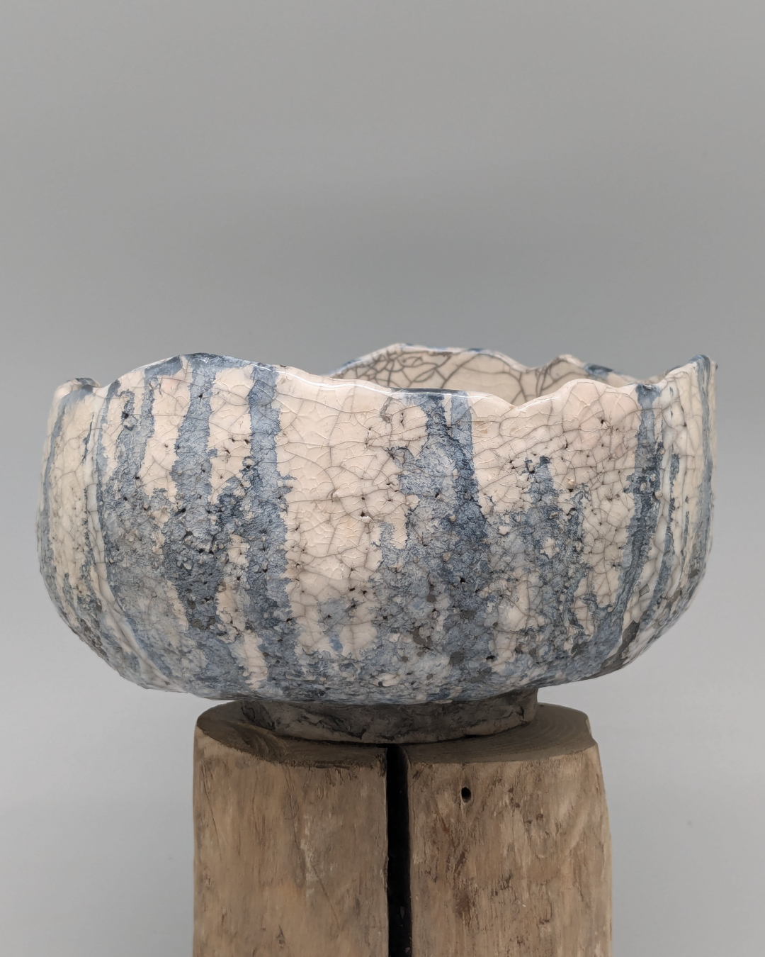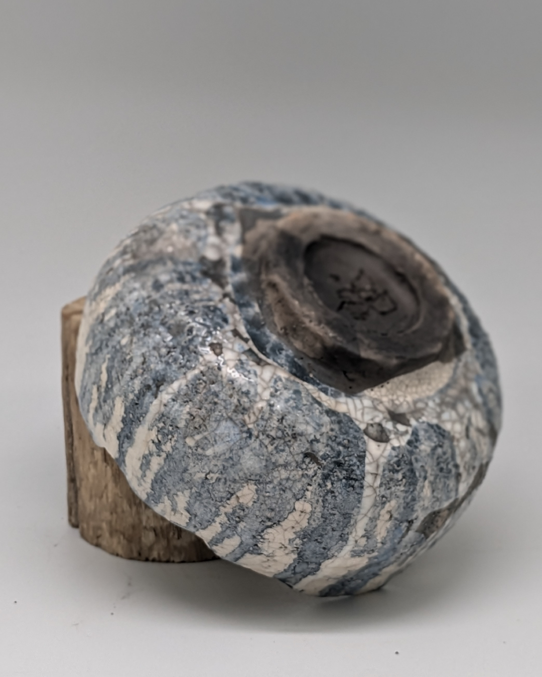 Hauteur 10 cm - diamètre max 18 cm - diamètre col 17 cm - diamètre pied 8 cm - poids 0.765 Kg - grès - oxydes - émail - enfumage